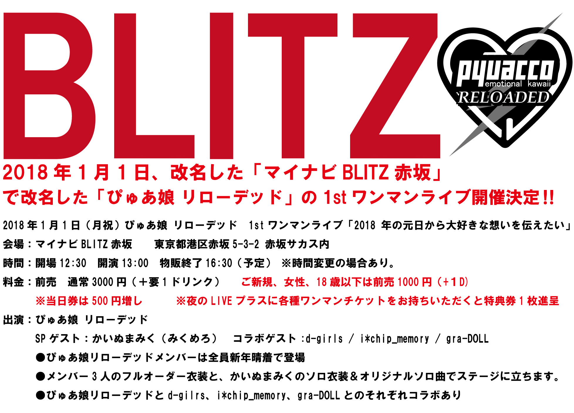 そのような行為によりケガ・事故等発生した場合は当事者同士で協議を頂き、主催者は関与致しかねます。 - 当日お昼にBLITZワンマン開催のぴゅあ娘リローデッドの出演も決定!