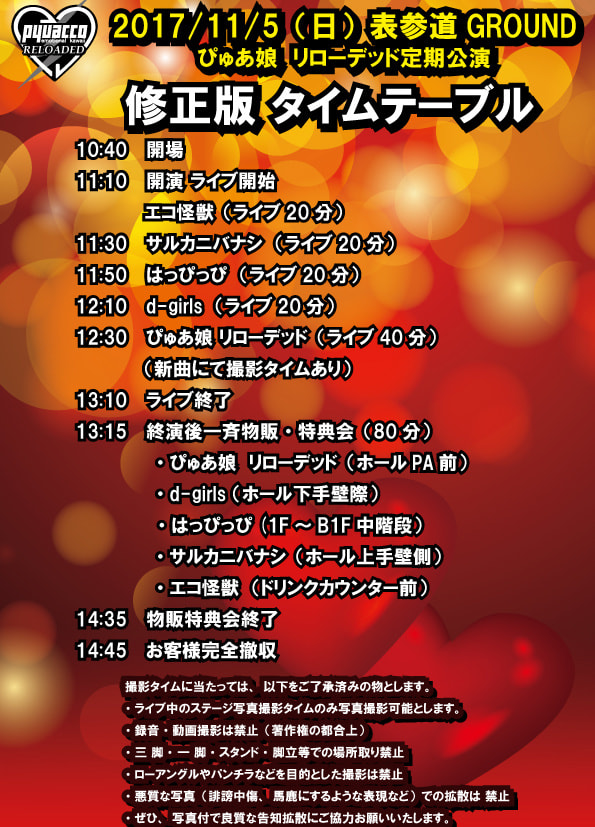 <タイムテーブル> 10:40 開場 11:10 開演 ライブ開始 エコ怪獣(20分) 11:30 サルカニバナシ (20分) 11:50 はっぴっぴ(20分) 12:10 d-girls (20分) 12:30 ぴゅあ娘 リローデッド(40分) (新曲にて撮影タイムあり) 13:10 ライブ終了 13:15 終演後一斉物販・特典会(80分) ・ぴゅあ娘 リローデッド(ホールPA前) ・d-girls (ホール下手壁際) ・はっぴっぴ(1F~B1F中階段) ・サルカニバナシ(ホール上手壁側) ・エコ怪獣 (ドリンクカウンター前) 14:35 物販特典会終了 14:45 お客様完全撤収