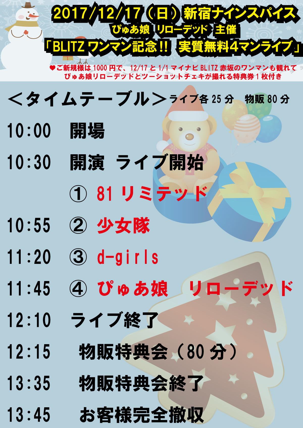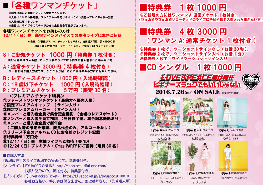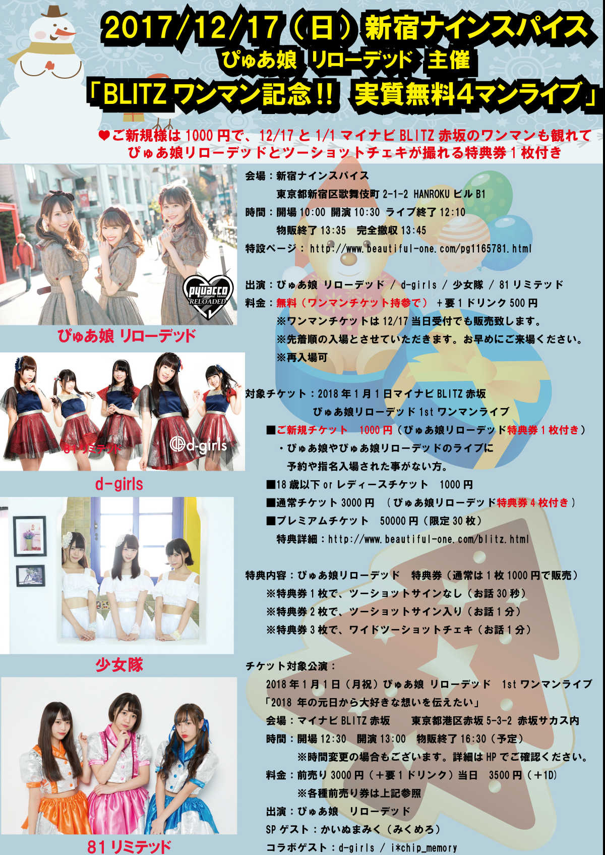 時間:開場10:00 開演10:30 ライブ終了12:10 物販終了13:35 完全撤収13:45 特設ページ: http://www.beautiful-one.com/pg1165781.html 出演:ぴゅあ娘 リローデッド / d-girls / 少女隊 / 81リミテッド 料金:無料(ワンマンチケット持参で) +要1ドリンク500円 ※ワンマンチケットは12/17当日受付でも販売致します。 ※先着順の入場とさせていただきます。お早めにご来場ください。 ※再入場可 対象チケット:2018年1月1日マイナビBLITZ赤坂 ぴゅあ娘リローデッド1stワンマンライブ ■ご新規チケット 1000円(ぴゅあ娘リローデッド特典券1枚付き) ・ぴゅあ娘やぴゅあ娘リローデッドのライブに 予約や指名入場された事がない方。 ■18歳以下orレディースチケット 1000円 ■通常チケット3000円 (ぴゅあ娘リローデッド特典券4枚付き) ■プレミアムチケット 50000円(限定30枚) 特典詳細:http://www.beautiful-one.com/blitz.html 特典内容:ぴゅあ娘リローデッド 特典券(通常は1枚1000円で販売) ※特典券1枚で、ツーショットサインなし(お話30秒) ※特典券2枚で、ツーショットサイン入り(お話1分) ※特典券3枚で、ワイドツーショットチェキ(お話1分) チケット対象公演: 2018年1月1日(月祝)ぴゅあ娘 リローデッド 1stワンマンライブ 「2018 年の元日から大好きな想いを伝えたい」 会場:マイナビBLITZ赤坂 東京都港区赤坂5-3-2 赤坂サカス内 時間:開場12:30 開演13:00 物販終了16:30(予定) ※時間変更の場合もございます。詳細はHPでご確認ください。 料金:前売り3000円(+要1ドリンク)当日 3500円(+1D) ※各種前売り券は上記参照 出演:ぴゅあ娘 リローデッド SPゲスト:かいぬまみく(みくめろ) コラボゲスト:d-girls / i*chip_memory
