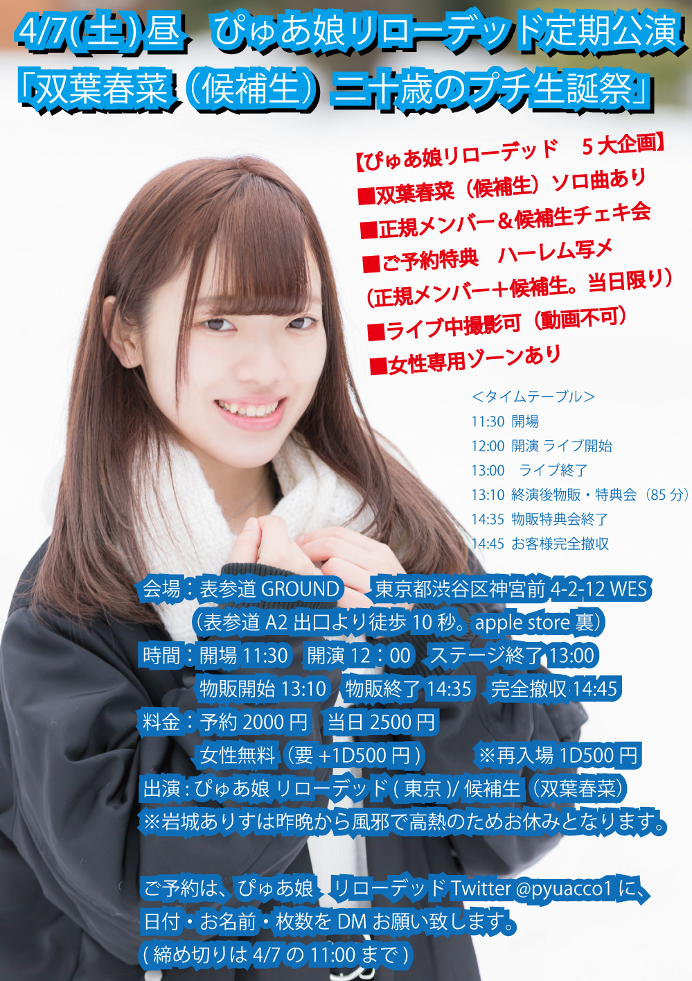 4/7(土)昼 ぴゅあ娘リローデッド定期公演「双葉春菜(候補生)二十歳のプチ生誕祭」