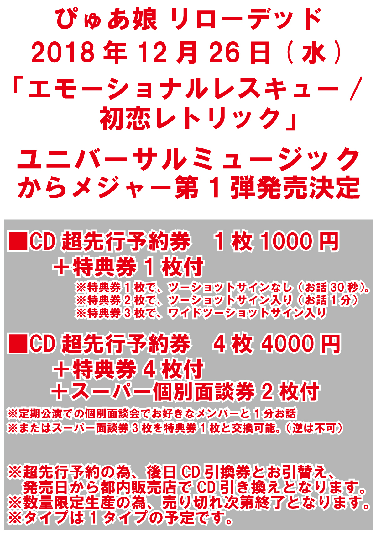 対象条件:ぴゅあ娘リローデッド定期公演に初めてのお友達が、11/24(土)当日にぴゅあ娘リローデッド入場して頂き、ご新規の方がCDを1枚でも予約購入していただくこと。